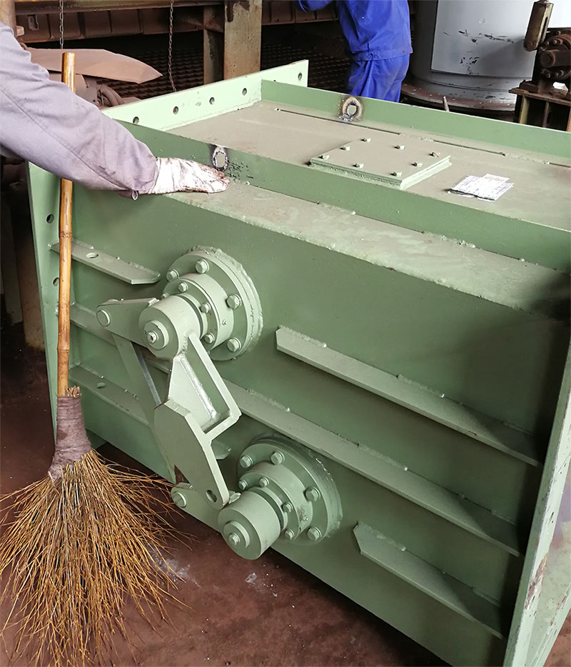 风箱蝶阀也是烧结机吸风装置的主要部件之一,用于调节风量,阀的开闭是通过角行程电动执行器和一组连杆机构实现的,电动执行器可自动控制,也可手动调节。